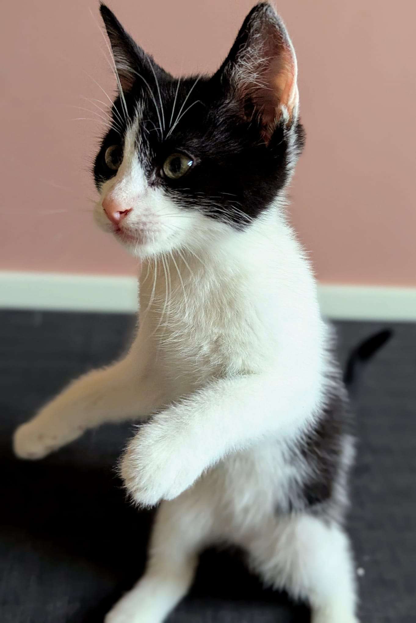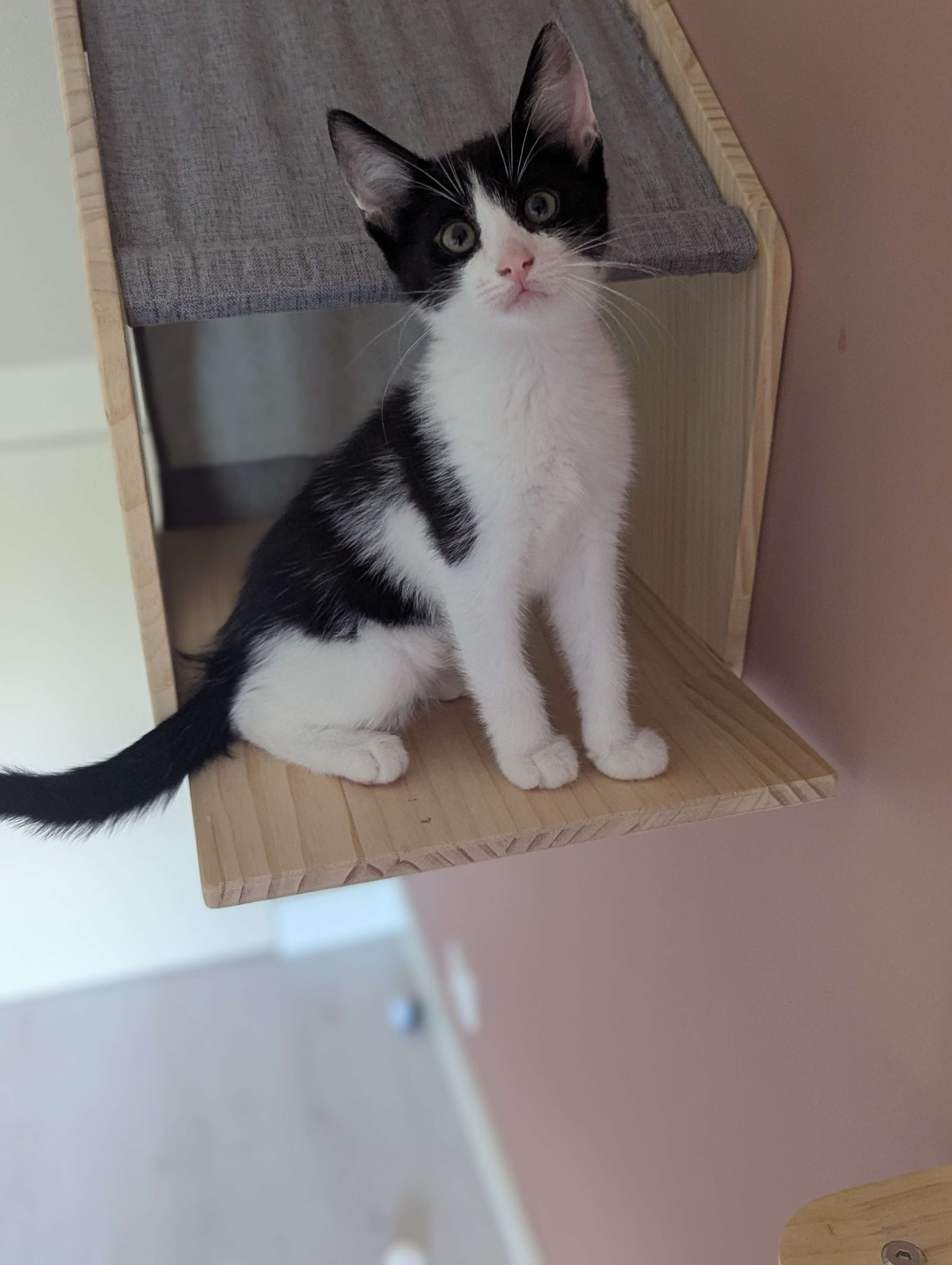 Hier ben ik dan! De grootste druktemaker van het stel! Zoek je ADHD op in een woordenboek dan staat mijn naam erbij. Ik ben overal en nergens, spring overal op, klim via je been naar boven, speel met mijn zusjes en grote broer en ren de hele kattenkamer door. Maaaarr... zodra ik lig te slapen ben ik weg. Dan krijg je mij met geen mogelijkheid meer wakker om te knuffelen of te spelen. Dat heet moe worden van jezelf zeggen ze dan. Ik ben heel blij dat mijn mama dankzij de stichting niet op straat is moeten bevallen. Dat maakt dat wij nu zo veilig kunnen spelen en rondrennen.